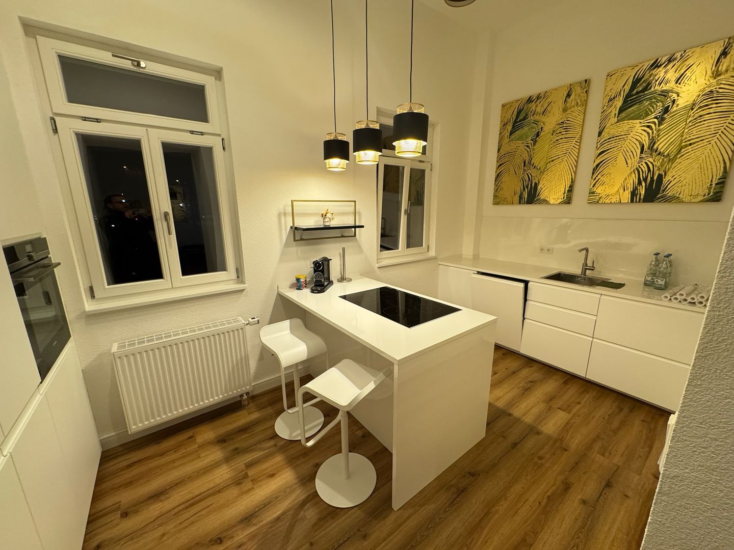 Der offene Wohn- und Essbereich ist hell und geschmackvoll eingerichtet. Die moderne Küche ist vollständig ausgestattet, unter anderem mit Nespresso-Espressomaschine, Backofen, Geschirrspüler und Kühlschrank mit Gefrierfach. Im Wohnzimmer steht ein großer 75-Zoll-TV zur Verfügung, in den beiden Schlafzimmern jeweils ein moderner 43-Zoll-TV. Kostenfreies Highspeed-WLAN mit mindestens 100 Mbit/s ist im gesamten Apartment verfügbar.