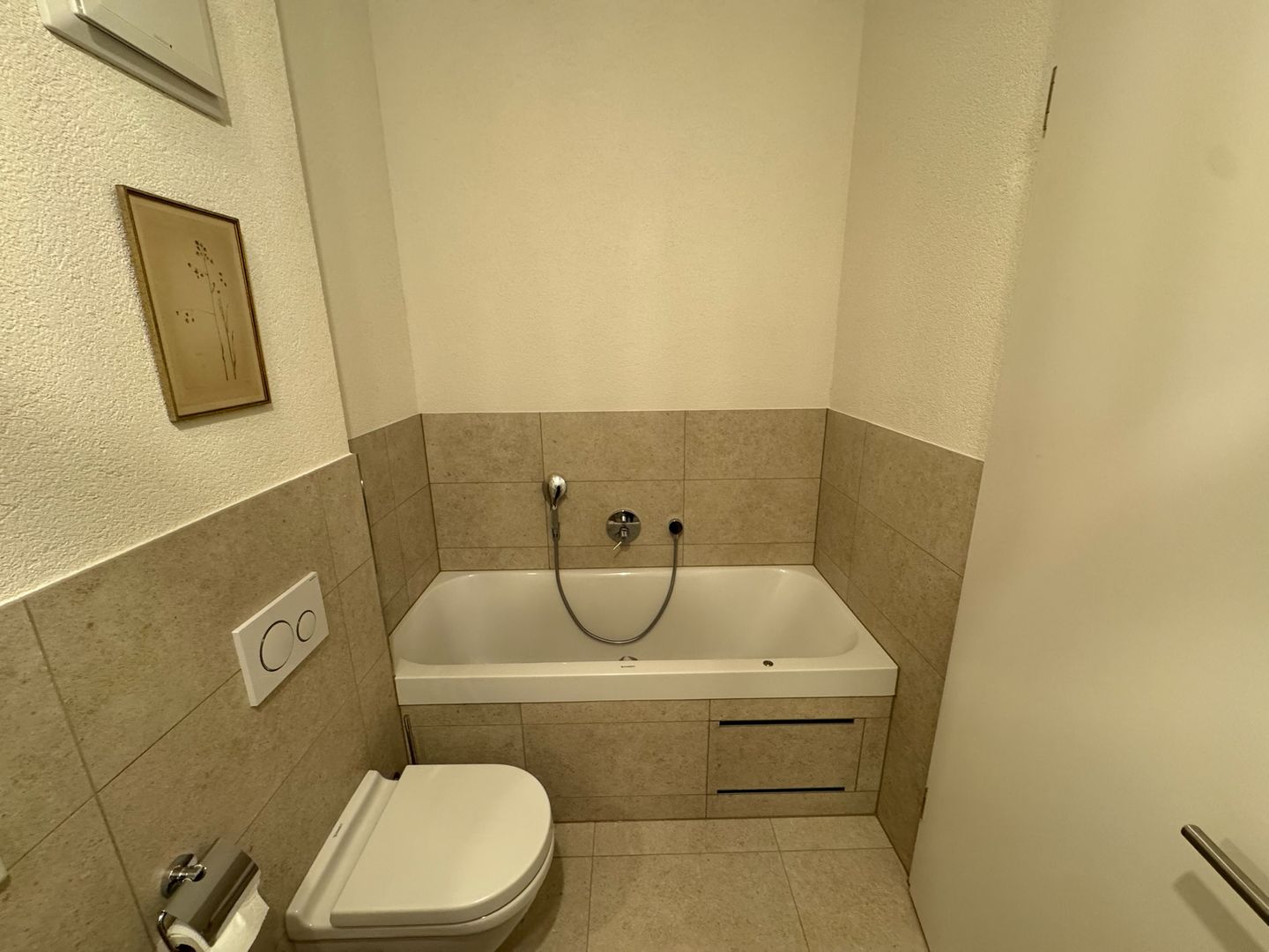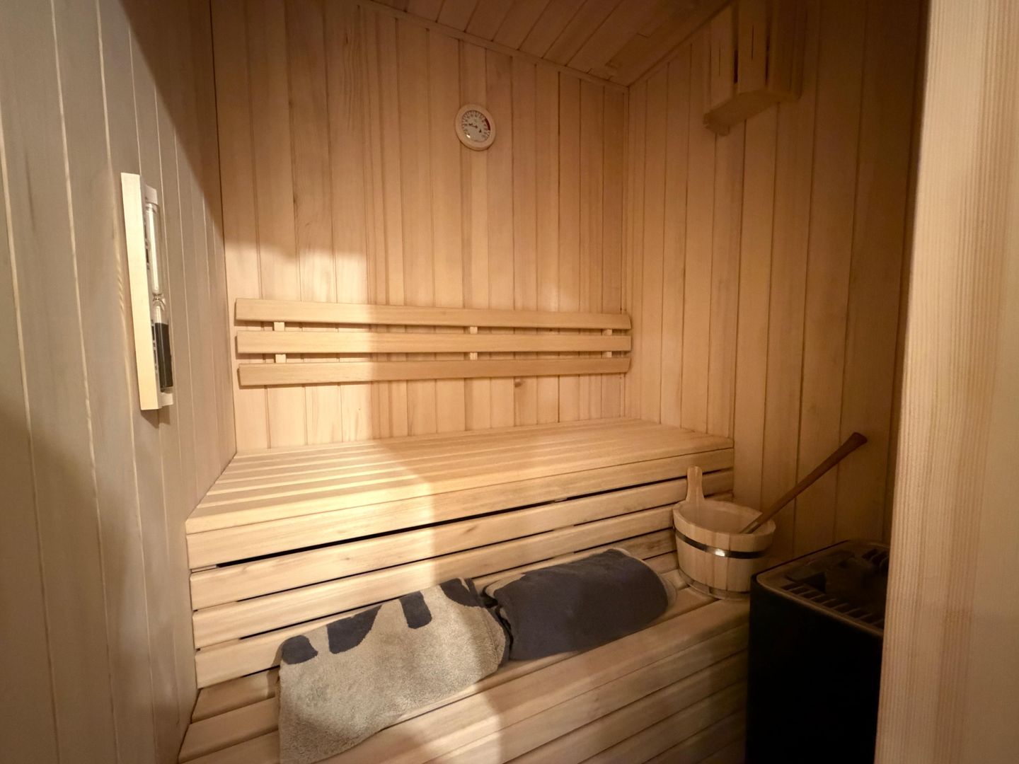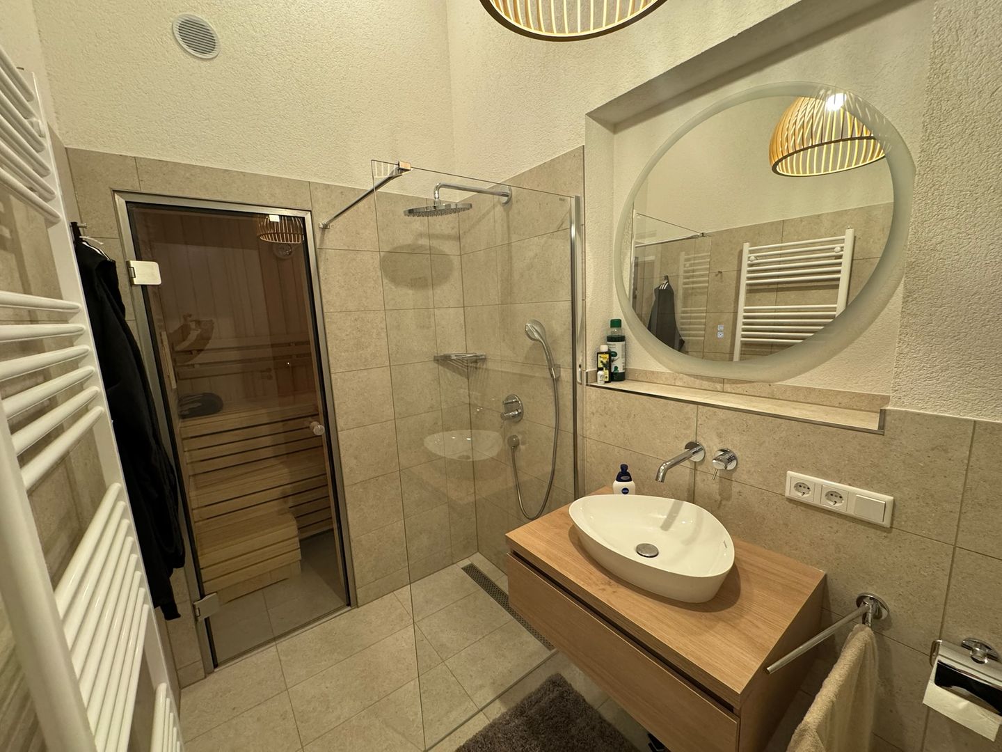 Ein besonderes Highlight ist das großzügige Badezimmer mit privater Sauna sowie einer Badewanne mit Whirlpool-Funktion. Zusätzlich steht eine bodengleiche Dusche zur Verfügung.