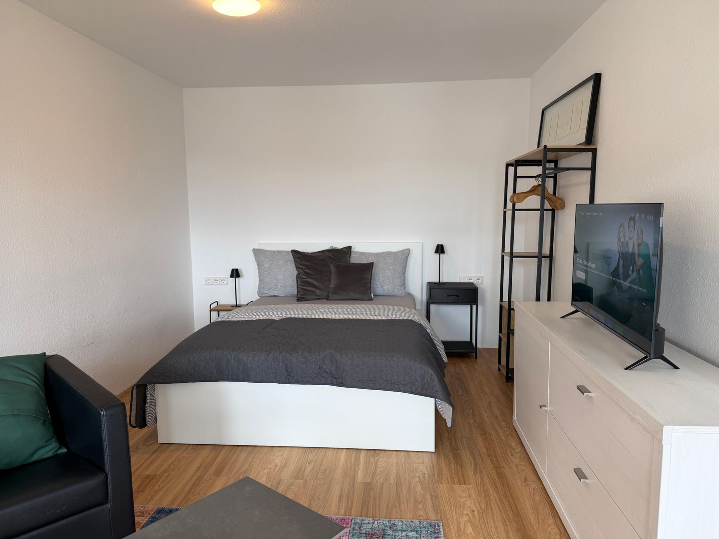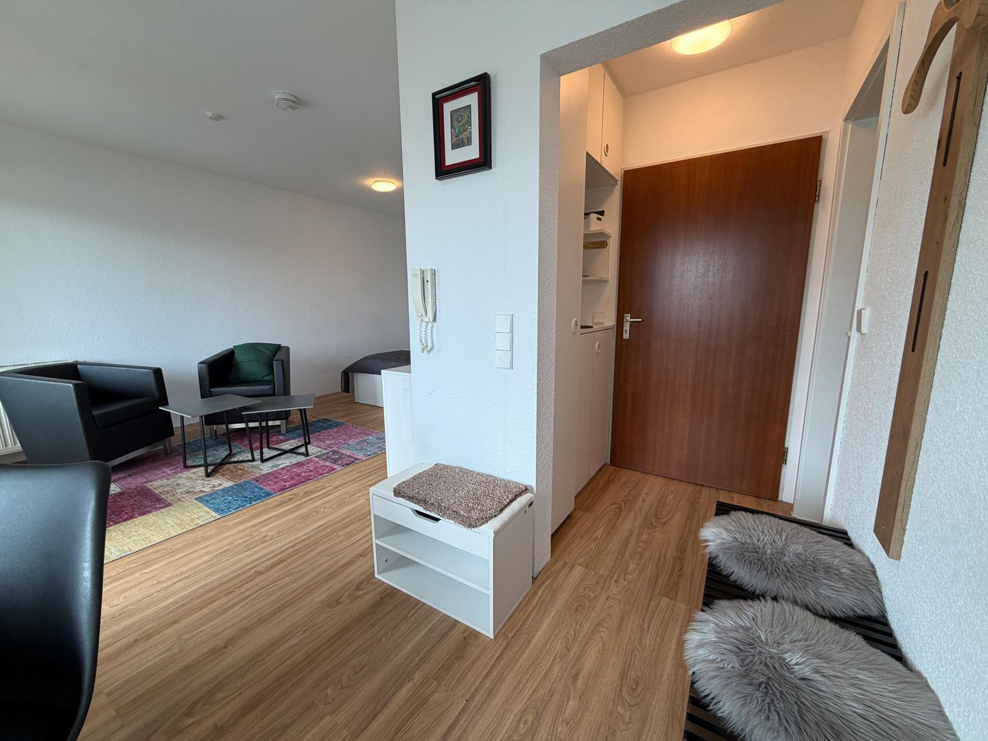 Der kombinierte Wohn- und Schlafbereich ist hell und funktional gestaltet. Ein moderner Vinylboden, Essbereich mit Tisch, eine gemütliche Sofaecke sowie Sessel, Kommode, Garderobe und Schuhschrank sorgen für Komfort und ausreichend Stauraum. Zur Unterhaltung steht ein 40-Zoll-TV mit digitalem Kabelanschluss und internationalen Kanälen bereit. WLAN und Internet sind selbstverständlich vorhanden. Sichtschutz an allen Fenstern sorgt zusätzlich für Privatsphäre.
