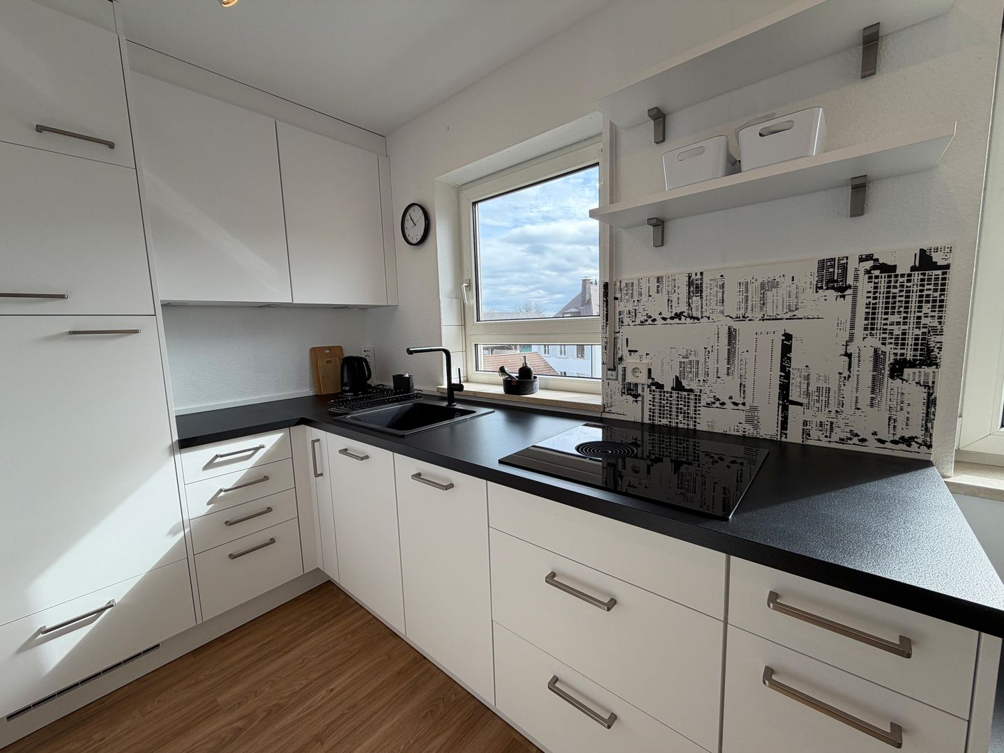 Die offene Küche ist harmonisch in den Wohnbereich integriert und vollständig für die Selbstversorgung ausgestattet. Zur Verfügung stehen ein Induktionsherd, Kühlschrank mit Gefrierfach und eine Spülmaschine sowie Geschirr, Besteck und Küchenutensilien. Für den perfekten Start in den Tag gibt es eine Kaffeemaschine, eine Nespresso-Espressomaschine, Wasserkocher und Toaster. Geschirrhandtücher und ein Abfalleimer sind ebenfalls vorhanden.