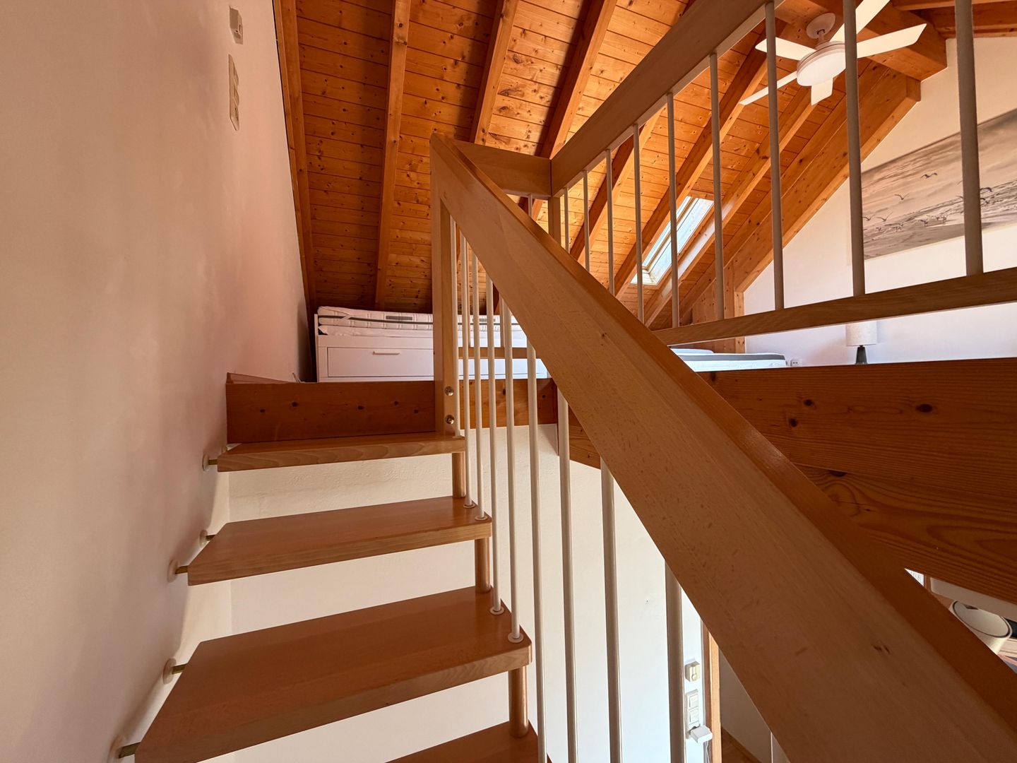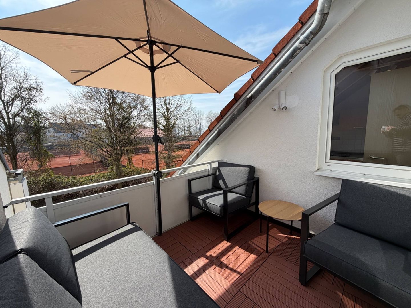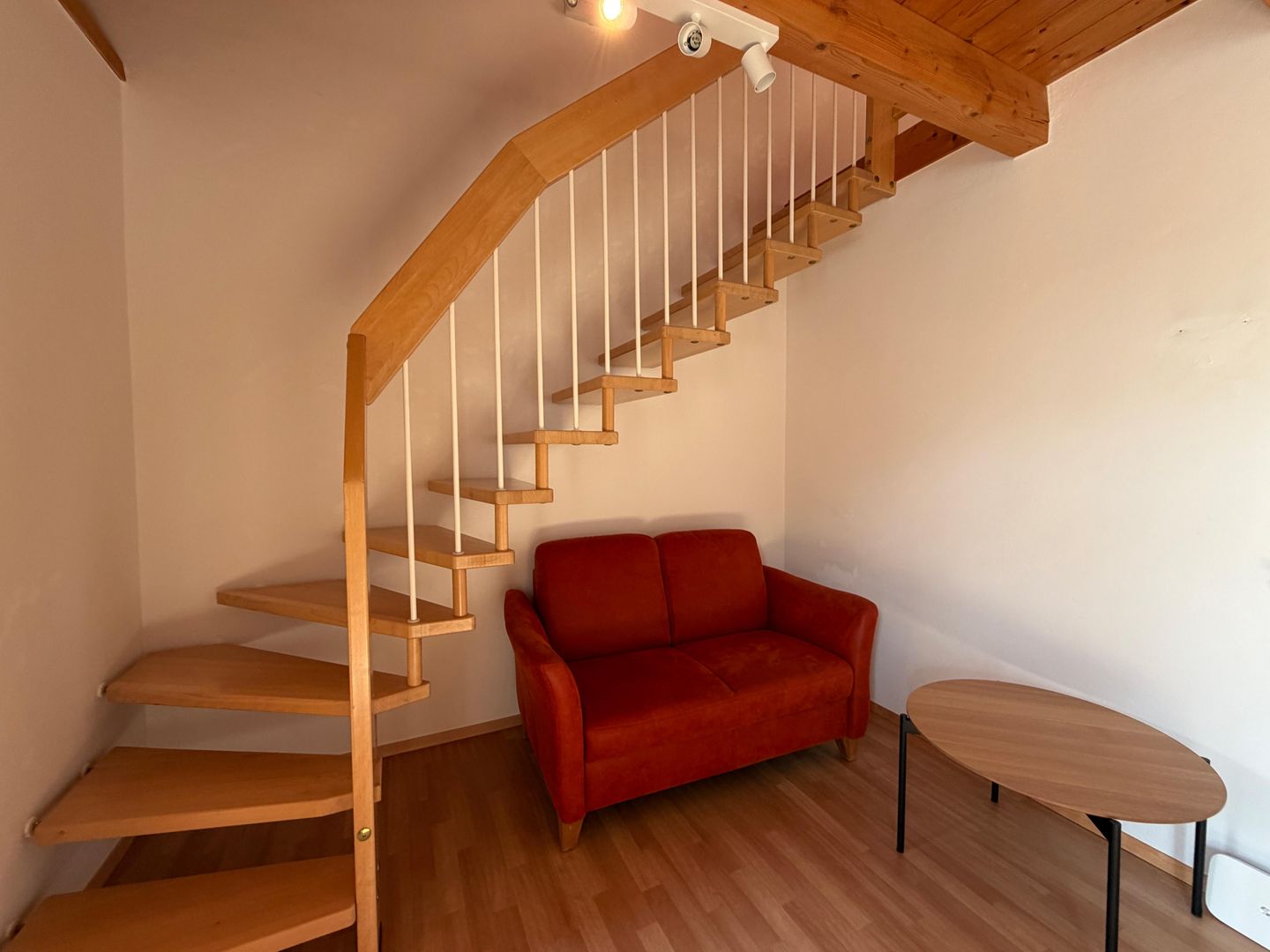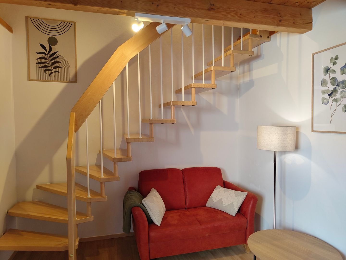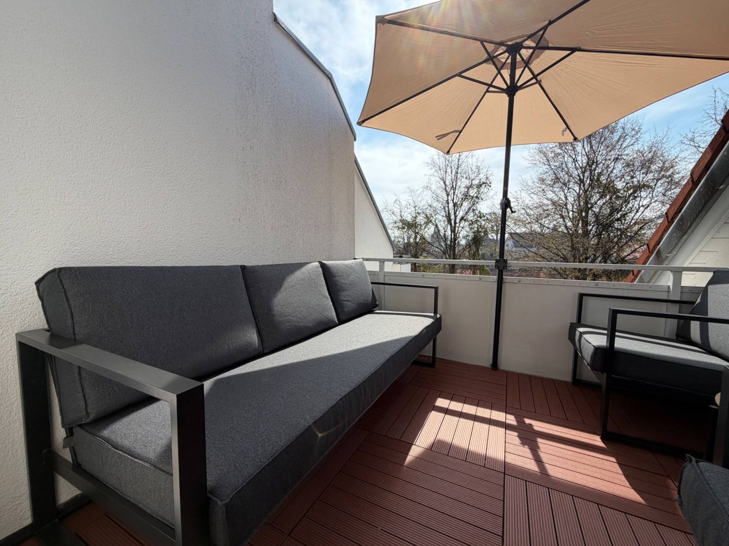 Die Wohnung verfügt über ein separates Schlafzimmer mit Doppelbett, ein Badezimmer mit Badewanne und Duschmöglichkeit sowie einen hellen Wohn- und Essbereich mit direktem Zugang zum Balkon. Dort laden Balkonmöbel zum entspannten Verweilen ein. Ein besonderes Highlight ist die offene Empore im Maisonette-Stil, auf der sich ein weiteres Bett befindet und die der Wohnung einen besonderen Charakter verleiht.
