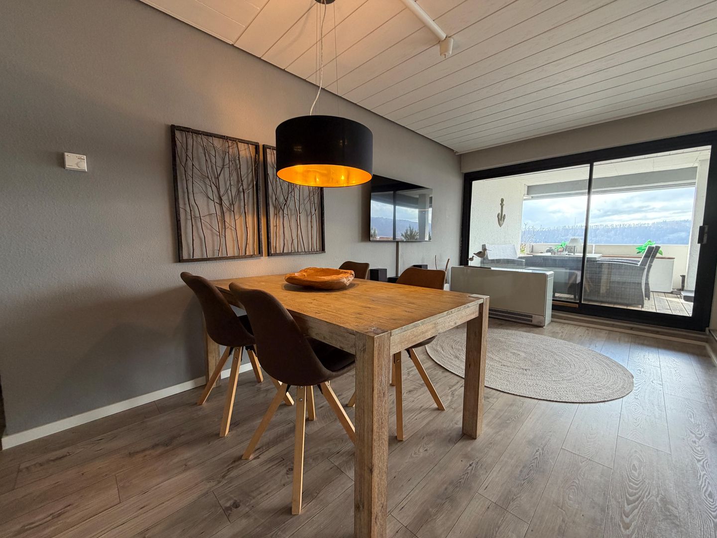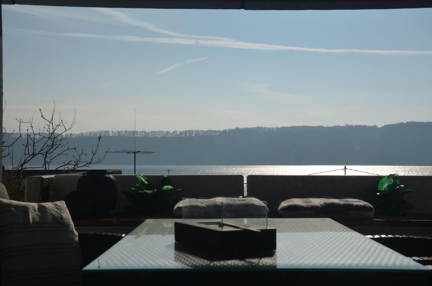 Der lichtdurchflutete Wohnbereich besticht durch eine großzügige Fensterfront, die den Blick auf den See auch im Inneren erlebbar macht. Die moderne Einrichtung mit Holz-Akzenten schafft eine warme und einladende Atmosphäre. Hier finden Sie eine komfortable Wohnlandschaft mit Schlaffunktion, einen Flachbildfernseher und eine Essgruppe für bis zu vier Personen. Eine Relaxliege lädt zum Verweilen ein, während die offene Küche mit einem Küchentresen alle Annehmlichkeiten für die Zubereitung köstlicher Mahlzeiten bietet. Die Küche ist voll ausgestattet und lässt keine Wünsche offen.