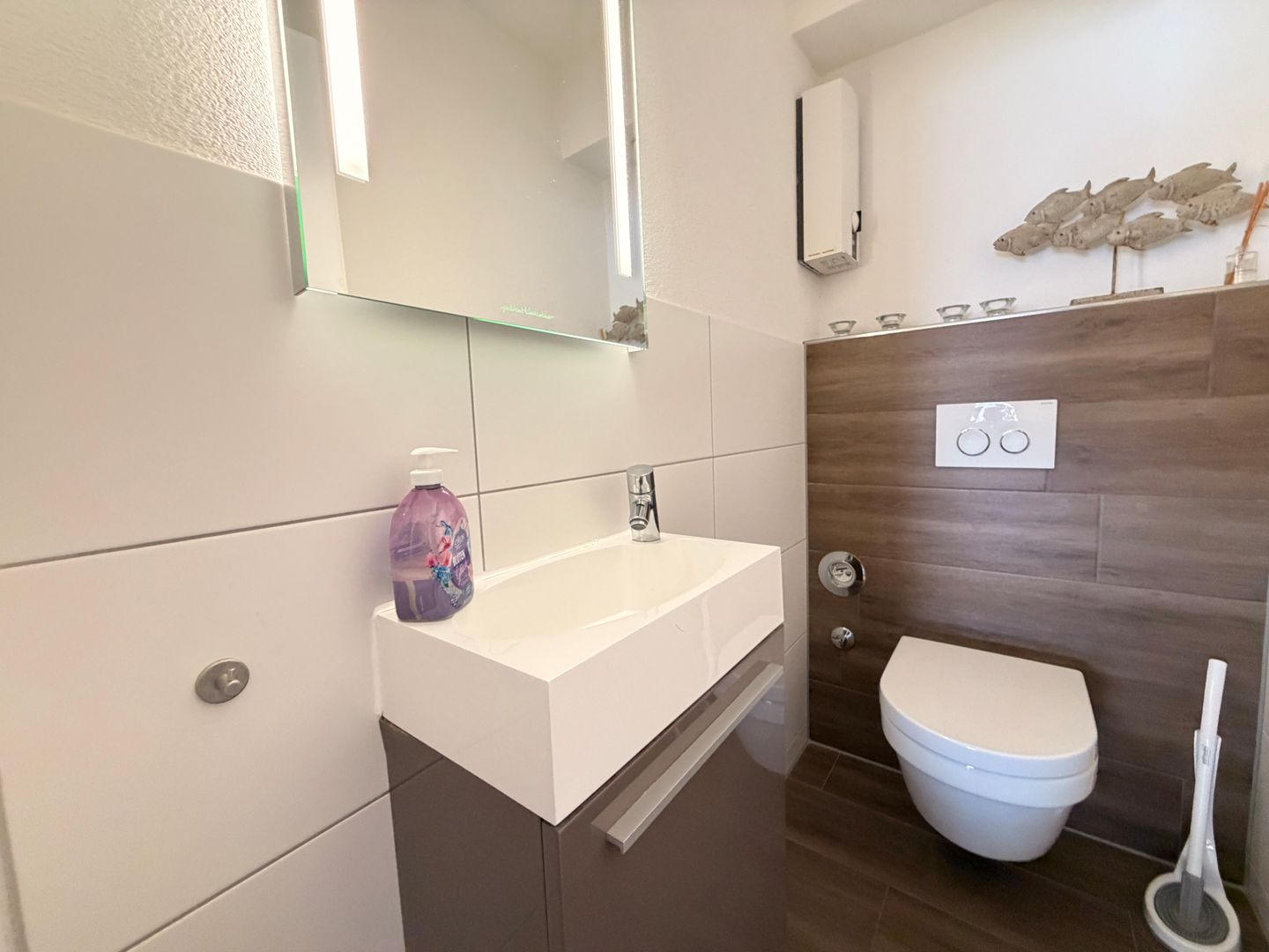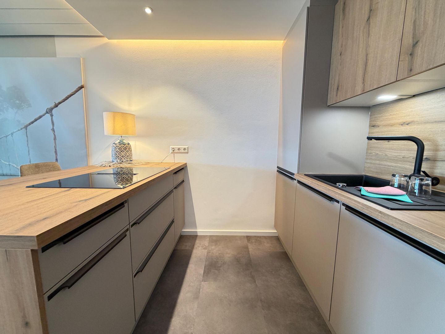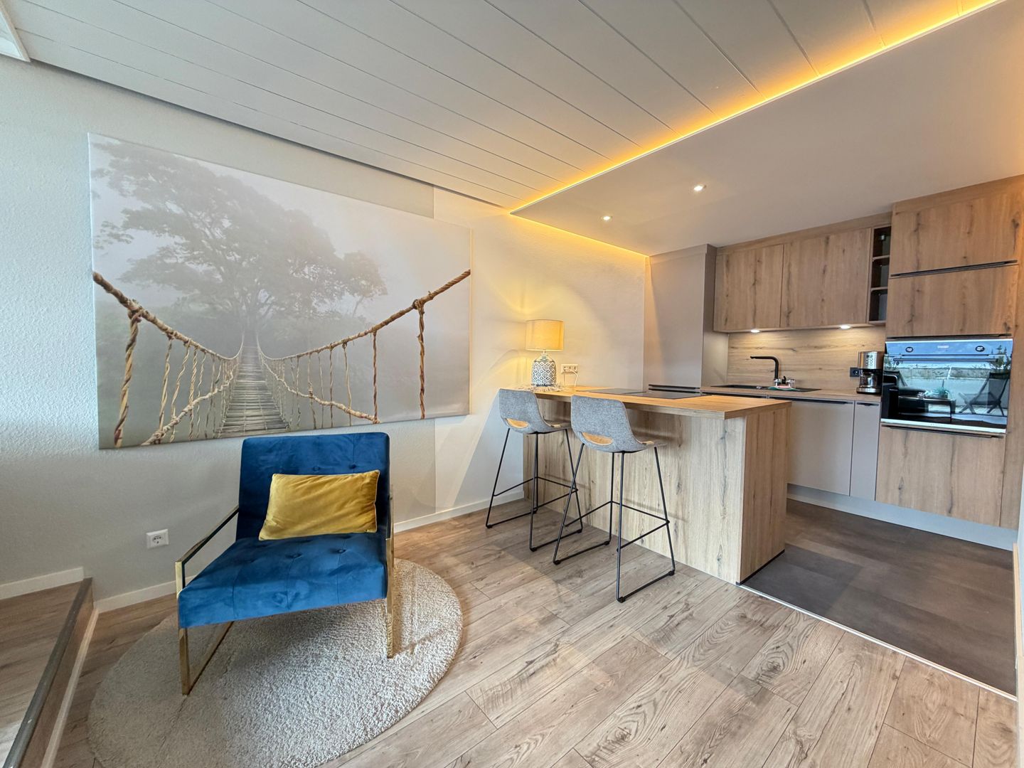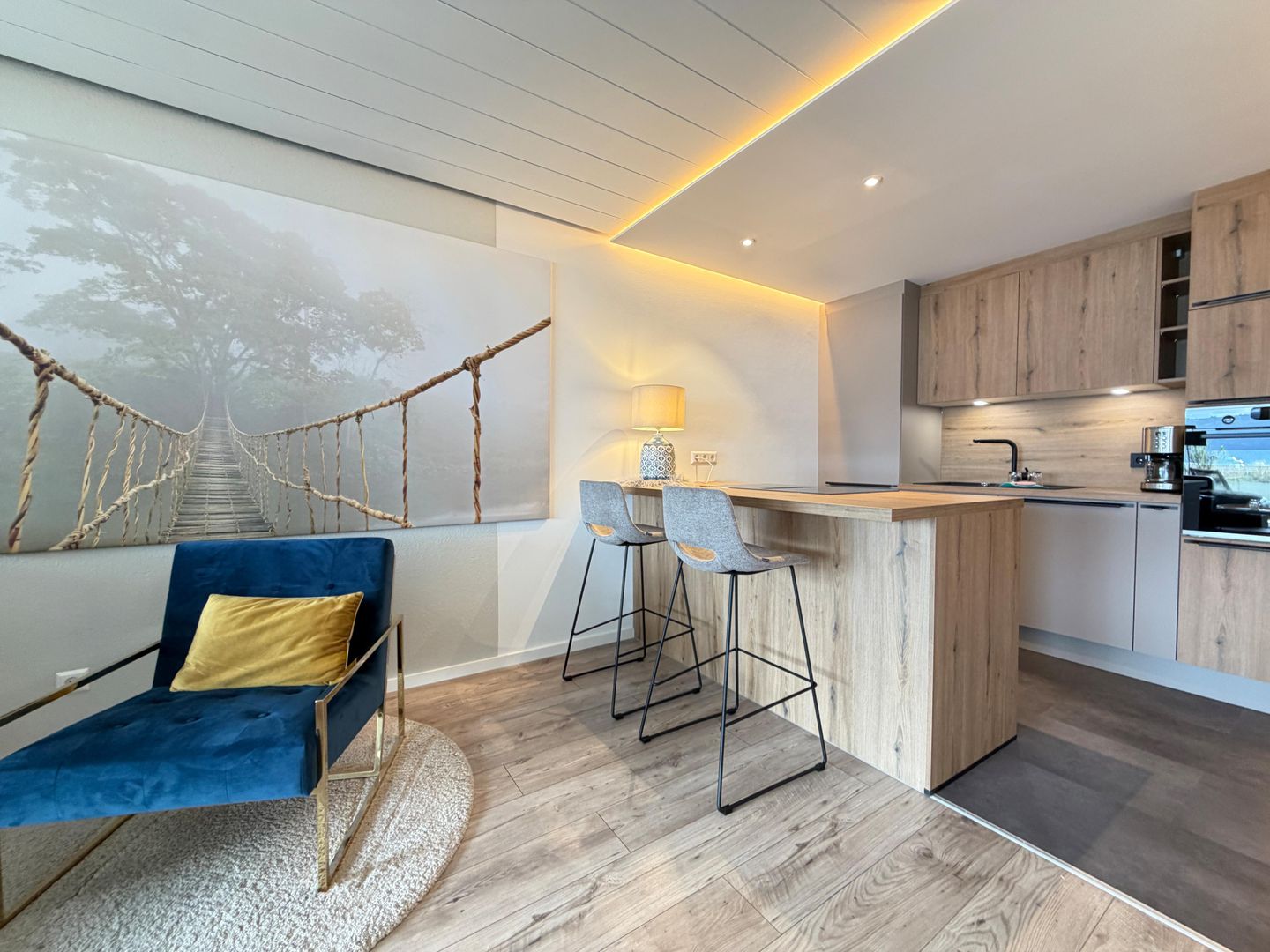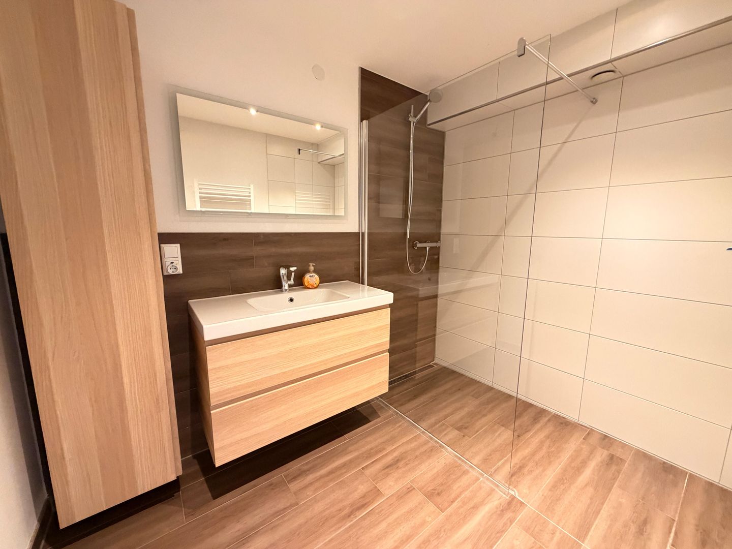 Das Badezimmer setzt ebenfalls Maßstäbe mit hochwertigen Fliesen in Holzoptik, einer bodenebenen Dusche mit Glas-Trennwand, einem eleganten Waschtisch mit beleuchtetem Spiegel und einem WC. Im separaten Schlafzimmer erwartet Sie ein großzügiges Doppelbett und ein geräumiger Kleiderschrank.