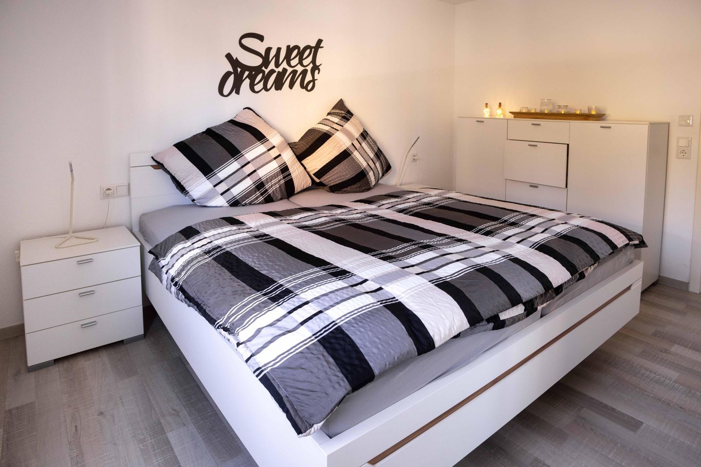 Das Schlafzimmer ist mit Vinylboden ausgestattet und bietet dank Verdunklungsmöglichkeiten und Sichtschutz an allen Fenstern angenehme Rückzugsmöglichkeiten. Für zusätzlichen Komfort sorgen Bettwäsche, Handtücher und Badetücher, die zur Verfügung gestellt werden. Ein Ganzkörperspiegel, Kommode, Schuhschrank und Wecker ergänzen die Einrichtung.