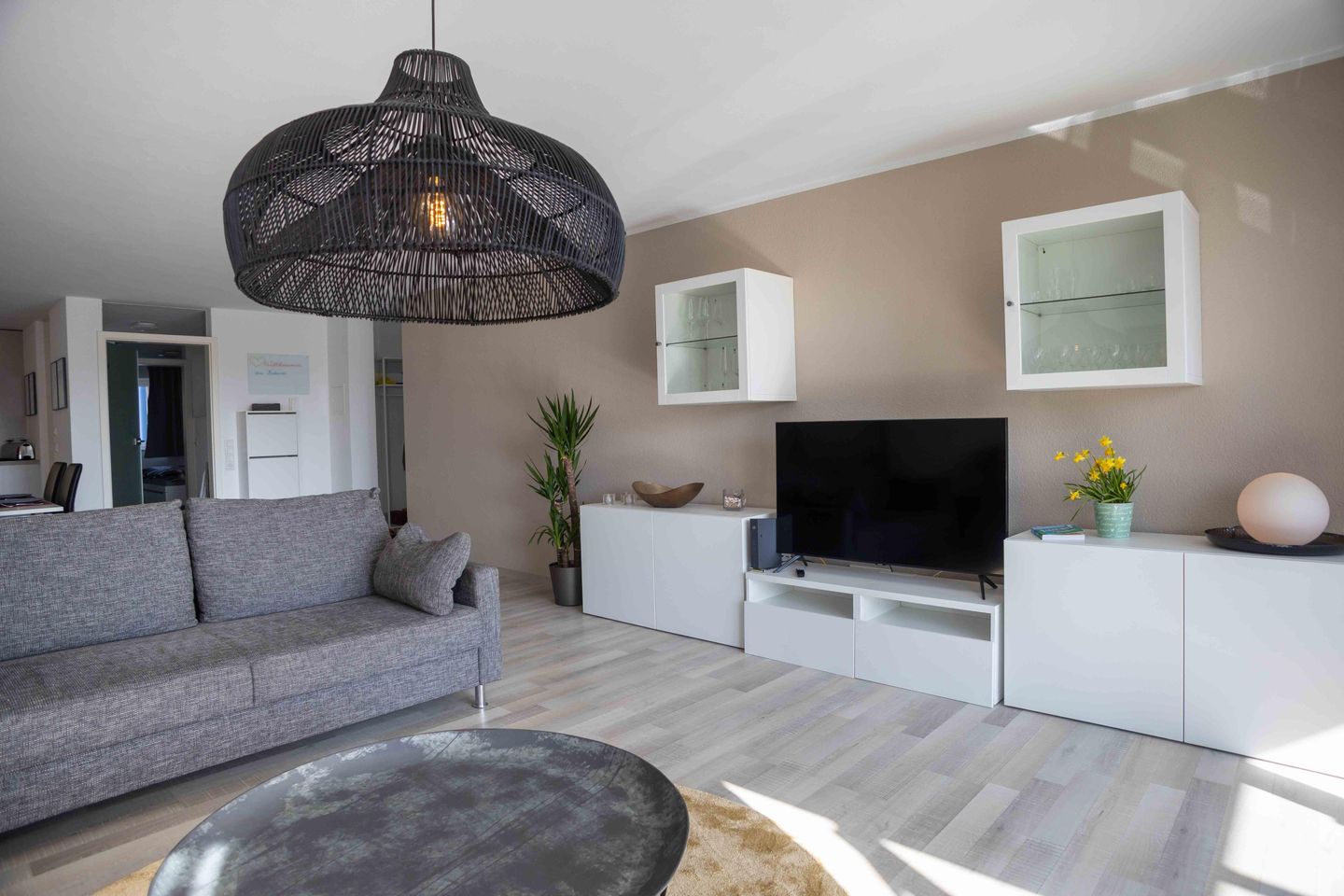 Der lichtdurchflutete Wohnbereich ist offen gestaltet und verbindet Wohn-, Ess- und Küchenbereich. Die hochwertige Ausstattung sorgt für angenehmen Komfort: Im Wohnzimmer stehen eine gemütliche Sofaecke sowie ein digitaler TV (40 Zoll), Radio und Bücher für entspannte Stunden bereit. Für kommunikative Abende sind Gesellschaftsspiele vorhanden. Die offene Küche mit Ceran-Kochfeld, Backofen, Nespresso-Espressomaschine, Kaffeemaschine, Wasserkocher, Toaster, Mixer, Kühlschrank mit Gefrierfach, Spülmaschine sowie allen wichtigen Küchenutensilien und ausreichend Geschirr lädt zum gemeinsamen Kochen und Genießen ein. Ein großzügiger Esstisch rundet den Essbereich ab.