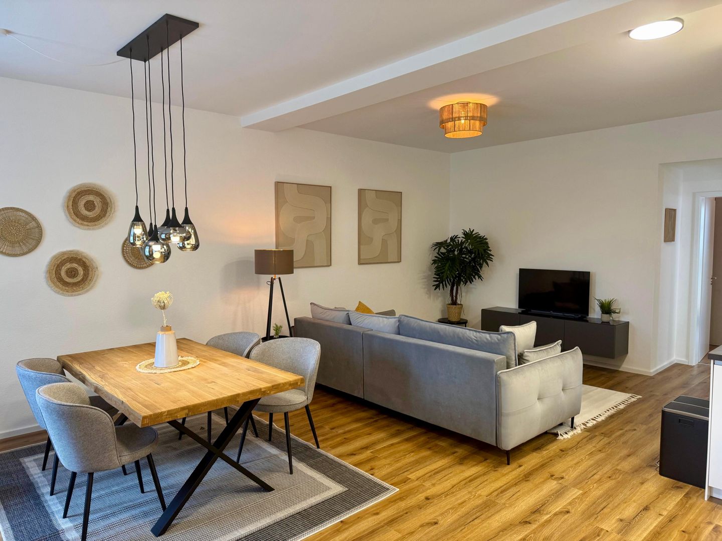 Der offen gestaltete Wohn- und Essbereich bildet das Herzstück der Wohnung. Hochwertige Materialien, warme Naturtöne und ein durchdachtes Lichtkonzept schaffen eine ruhige, elegante Atmosphäre. Große Fenster sorgen für viel Tageslicht und unterstreichen die Großzügigkeit der Räume. Der Wohnbereich ist mit einem komfortablen Schlafsofa ausgestattet und bietet zwei zusätzliche Schlafplätze.